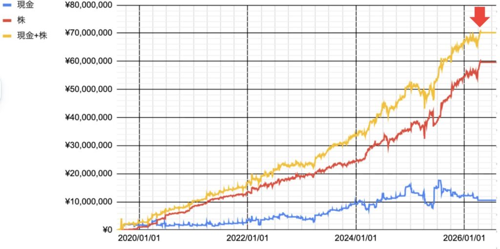 最近まで戦争やホルムズ海峡封鎖関連で下がっていた株価が回復したことで、晴れて7,000万円の大台に乗ることができました。