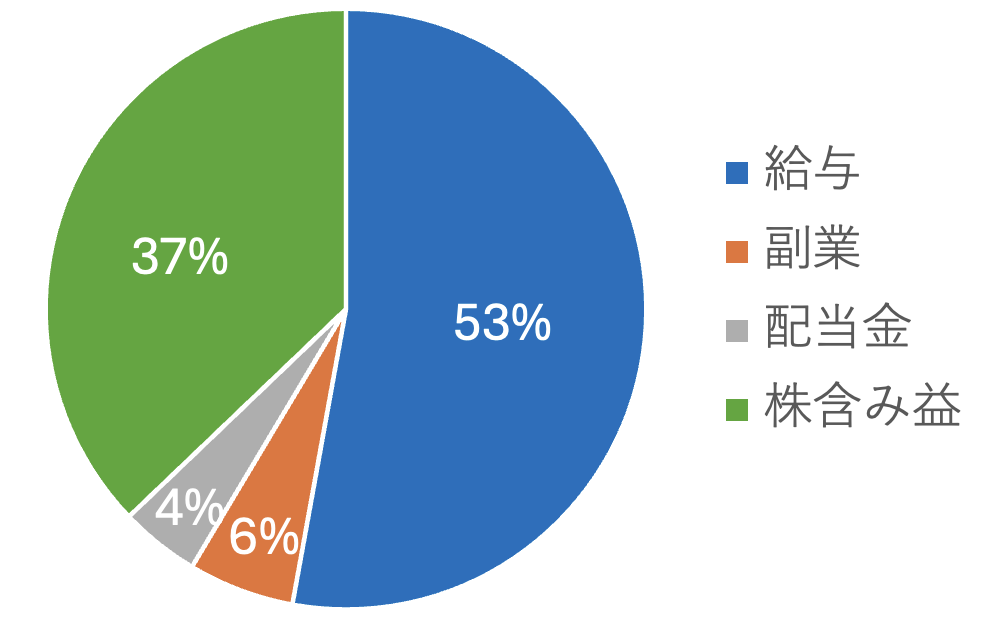 グラフで見ると、会社員+副業が約60%、株式投資(配当+含み益)で約40%となりました。