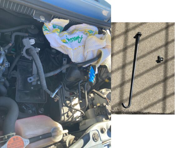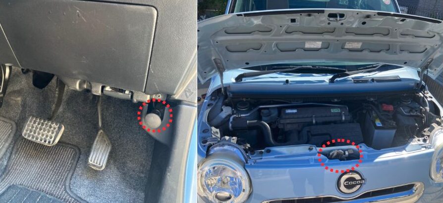 運転席の下の方のボタンやレバーなどを開けて、ボンネットが少し開いたら、中央付近の爪部分を押して解除し、ボンネットを開けます。