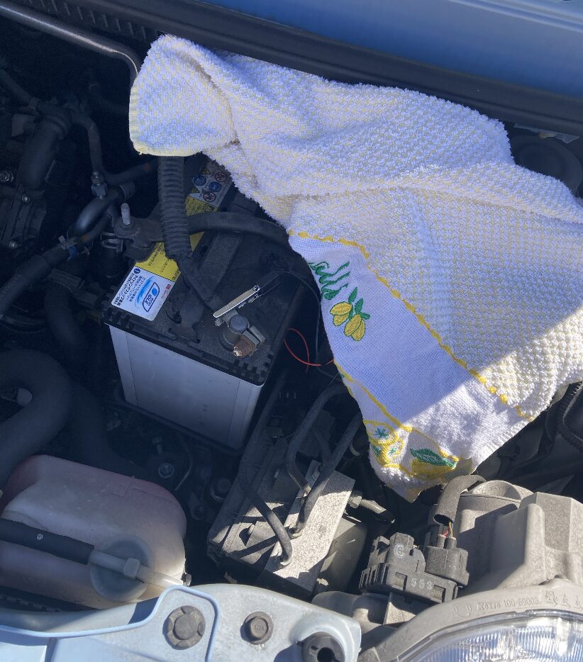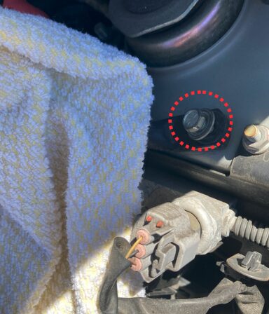 作業の際は、スパナなどの工具が誤ってバッテリー端子に触れないよう、作業していない方の端子をタオルや雑巾で覆うと安心です。